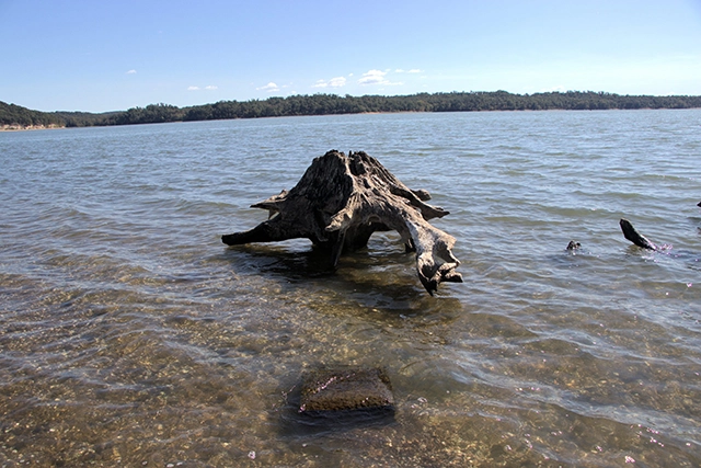 There are no buoys, no dock, and no signs. That also means hazards. Even when submerged, the tombstone and a nearby stump can damage a prop if you are off the main channel.