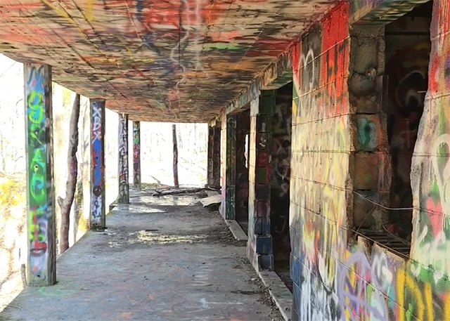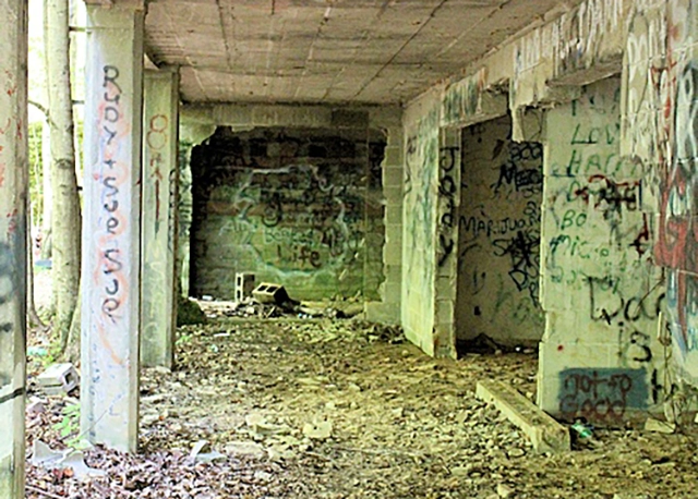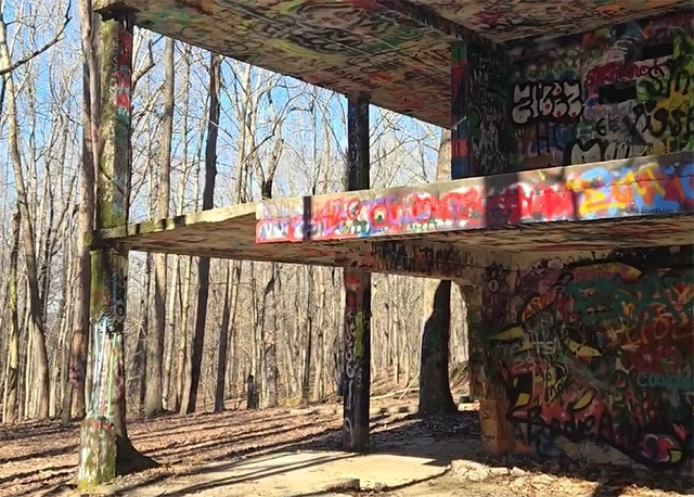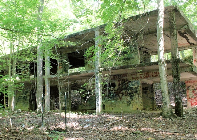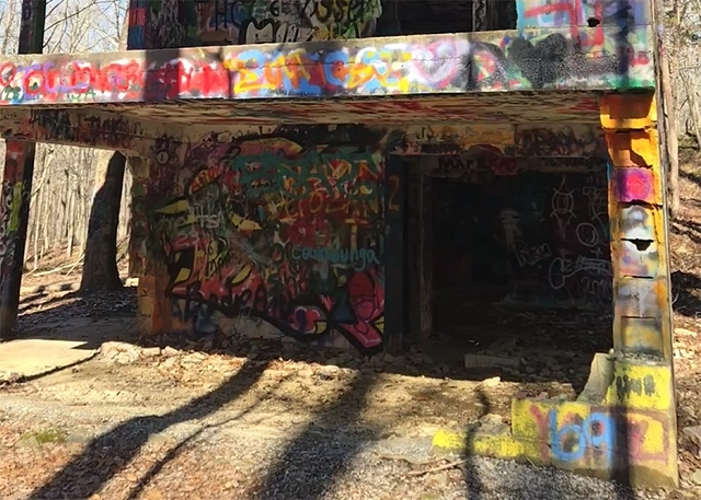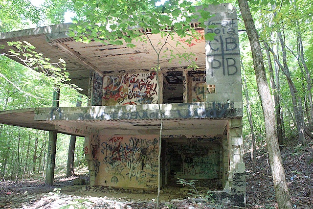 The structure was once the retirement home of a riverboat captain named Grover Marler, built before the recreation area existed and long abandoned after the Tennessee Valley Authority purchased the land. Today its walls are covered in graffiti, and remnants of gatherings – empty bottles and discarded items – tell the tales of past visitors drawn to its mystery.