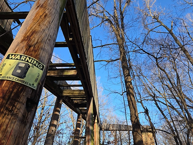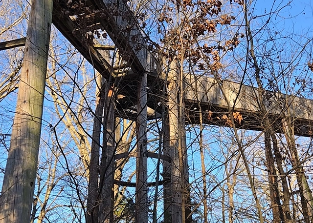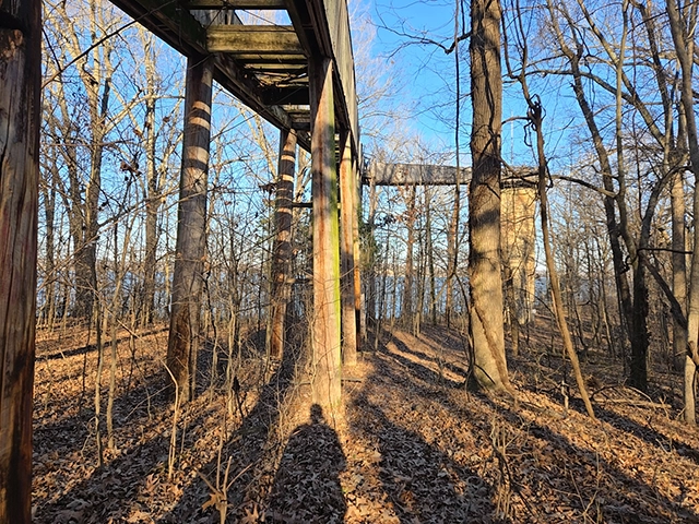 Access begins on Mulberry Flat Road, where visitors park at the gate and continue on foot down the closed pavement. The walk is short, quiet, and a little eerie in the best way. What remains at the site is no longer safe to climb. The wooden ramp that once led into the silo has deteriorated, leaving behind fragments of boards and hardware that hint at how the overlook once worked.