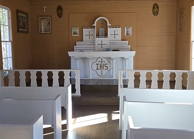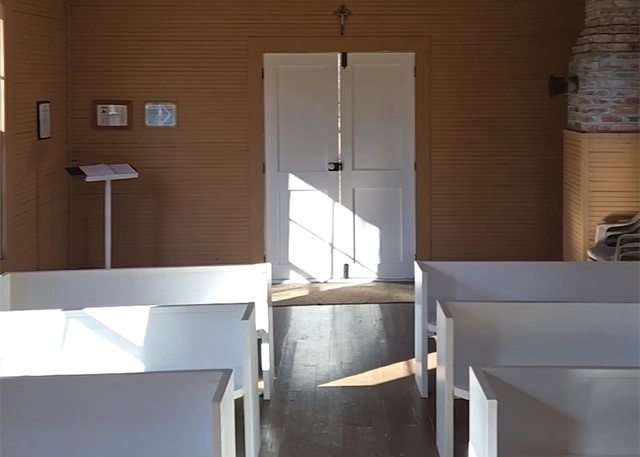 The church is easy to access, with a small parking area nearby and a clear view of the building as you arrive. Its simple white exterior and clean lines give it a calm, grounded presence in the woods. Inside, the space is intact and orderly, with light filtering through restored windows and a sense of care that reflects the value placed on this place. It’s the kind of setting that invites quiet reflection rather than exploration for exploration’s sake.